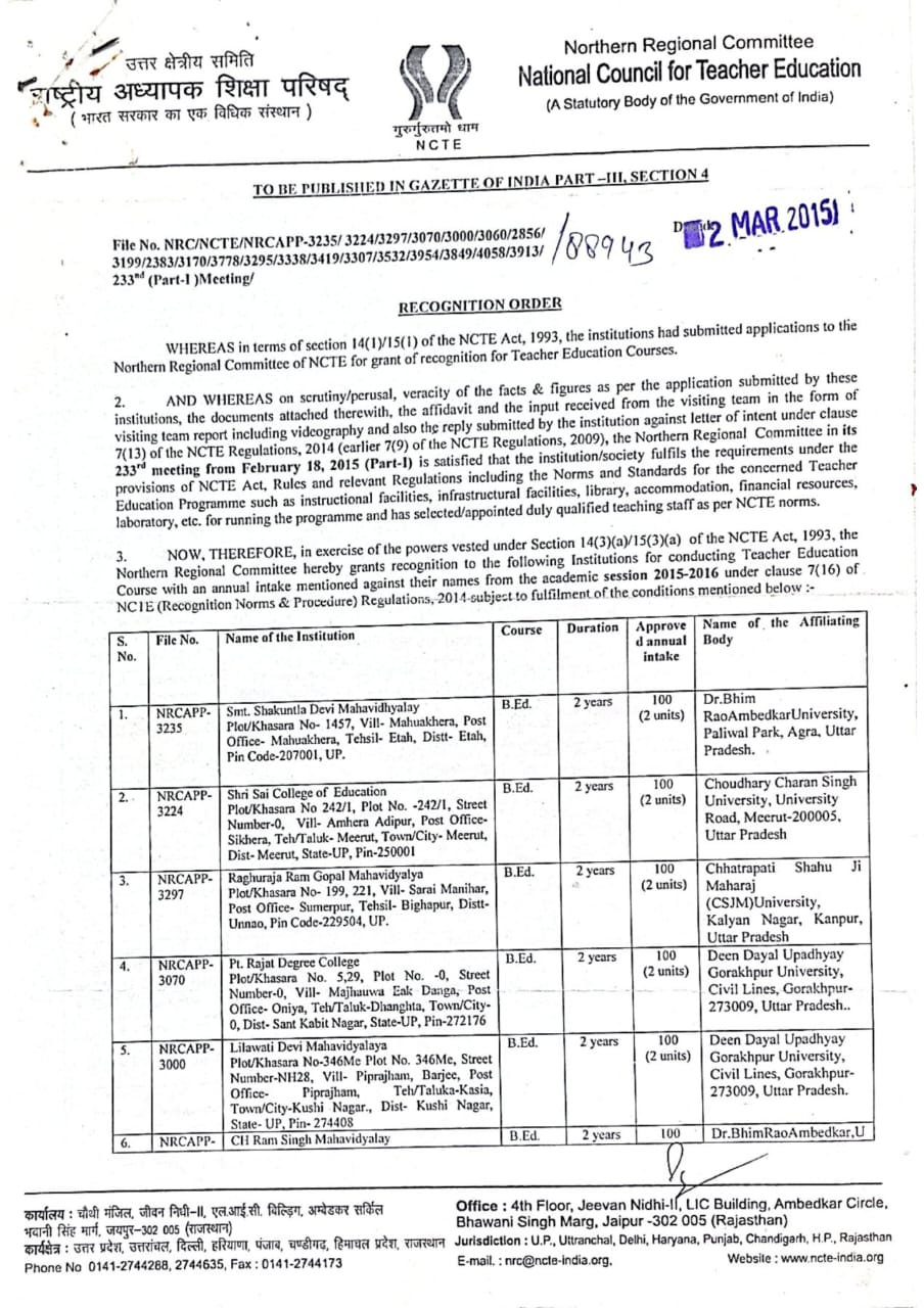 | (B.ED. COURSE) NCTE RECOGNITION LETTER | |