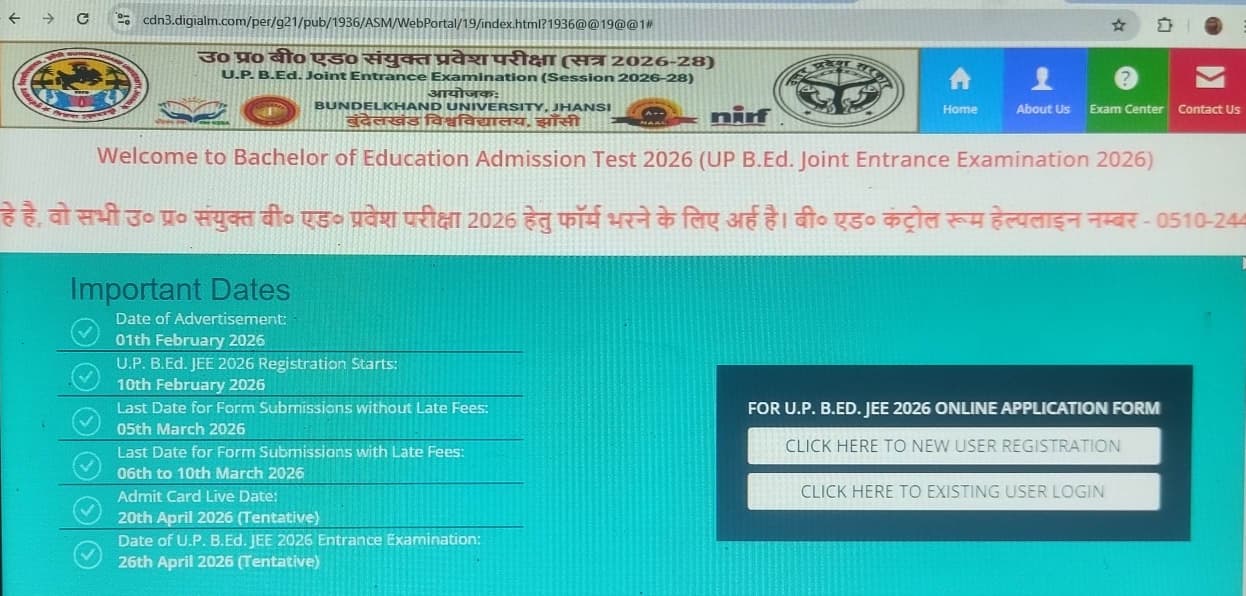 | Date of Advertisement: 01th February 2026 U.P. B.Ed. JEE 2026 Registration Starts: 10th February 2026 Last Date for Form Submissions without Late Fees: 05th March 2026 Last Date for Form Submissions with Late Fees: 06th to 10th March 2026 Admit Card Live Date: 20th April 2026 (Tentative) Date o |